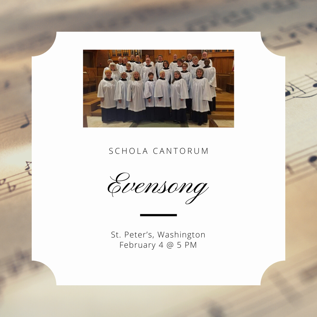 Schola Cantorum, whose mission is to promote the Anglican tradition of choral evensong, will return to sing on Sun., Feb. 4th at 5 p.m. at St. Peter’s, Washington. This group of singers from our diocese is conducted by Kevin Kerstetter of St. Michael’s in Raleigh.